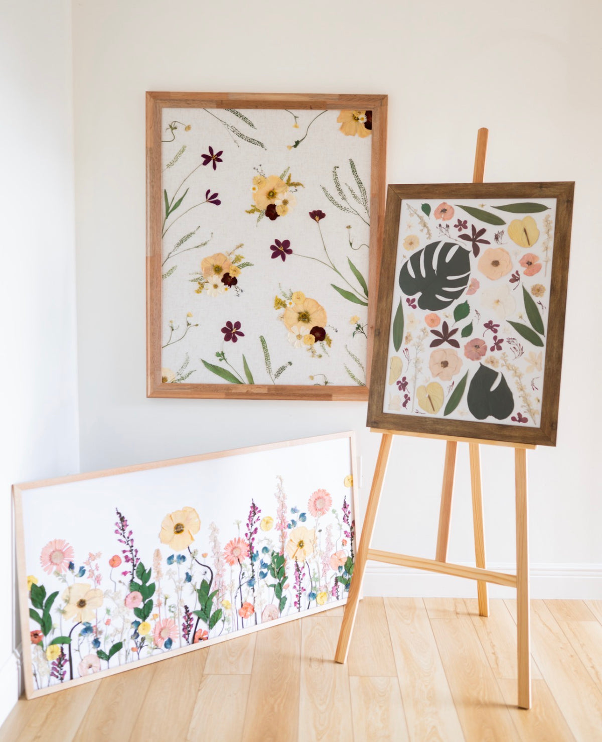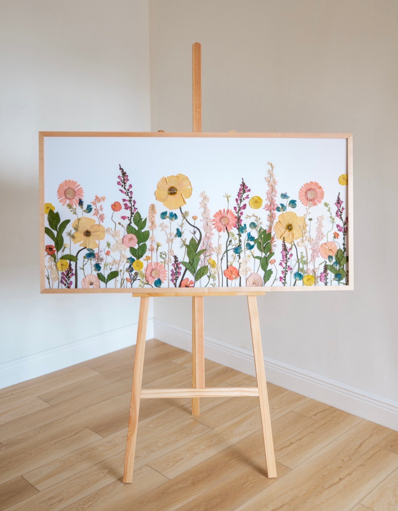 Framed in natural wood, the softness of the florals contrasts beautifully against clean walls, allowing the color story to feel airy rather than busy. Every element is real and preserved at its peak, sealed to maintain its natural beauty for years to come.