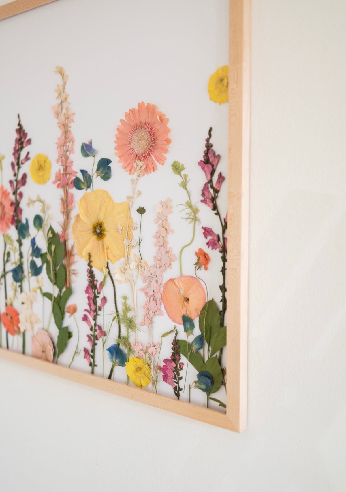 Wildflower gardens captures the gentle movement of a blooming field delicate peach and blush florals, buttery yellow poppies, soft coral daisies, and intricate stems layered to create depth and natural rhythm. Each flower has been individually pressed and thoughtfully placed to mimic the organic rise and fall of wildflowers growing freely.